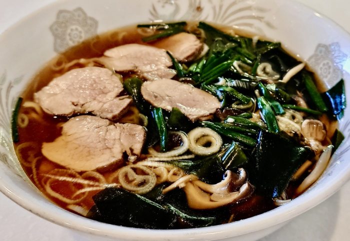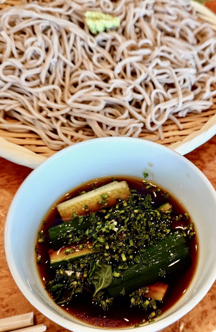 畑の紫蘇の実とキュウリを楽しむ蕎麦
