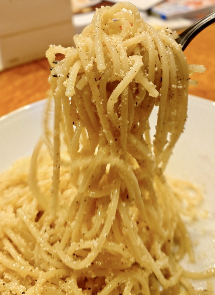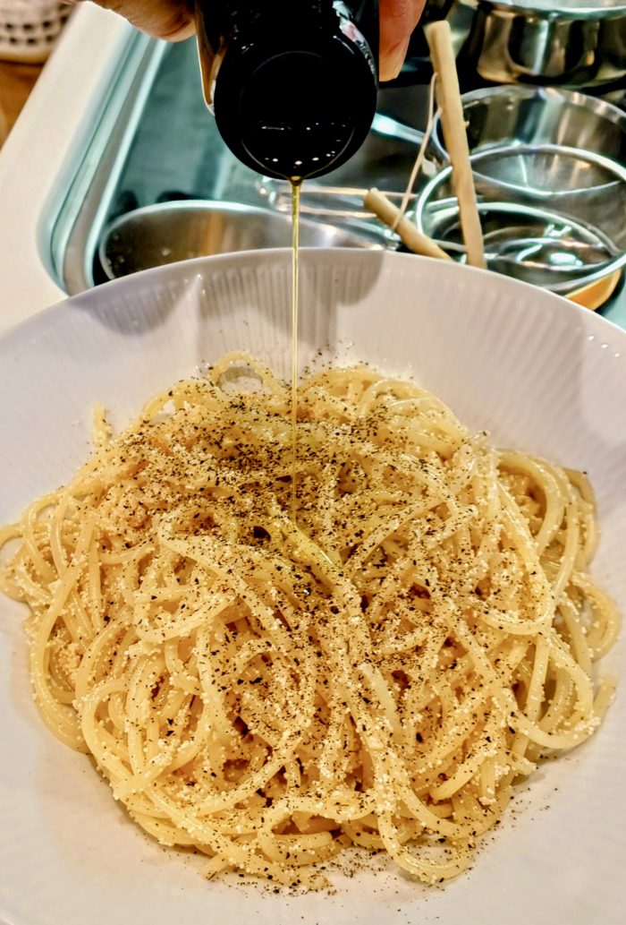 明太子スパゲティに搾りたての我が家のオリーブオイル