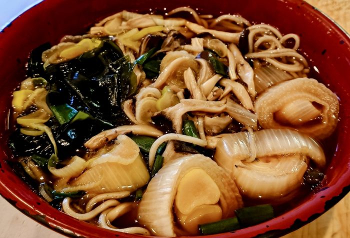 大量のきのこ、わかめ、極太下仁田ねぎで蕎麦