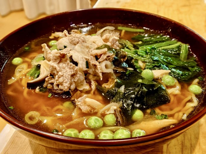 ほうれん草、グリーンピース、葱、平茸、わかめ