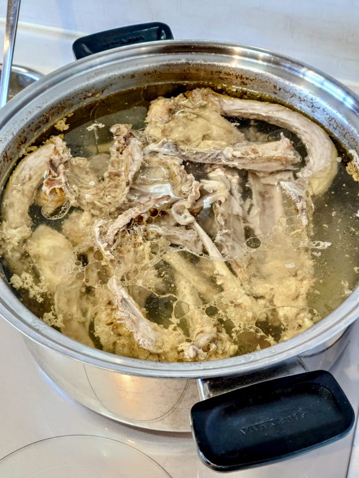 強く沸騰させないで比内地鶏の鶏ガラスープ