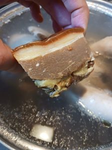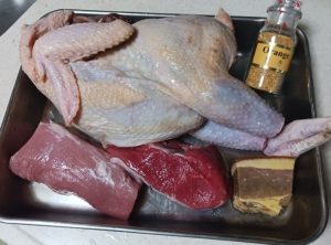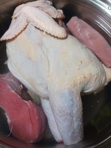 上湯の材料は、老鶏、赤身肉、金華ハム、香辛料が基本で、香辛料は、陳皮や白粒胡椒などお好みのようです。今回は、「あすなろ卵鶏」の中抜き1羽、牛豚の赤身肉200gずつ、金華ハム100g、陳皮を用意しました。あすなろ卵鶏は、「緑の一番星」の採卵鶏で、卵を産み終えた約1歳の雌の鶏です。
