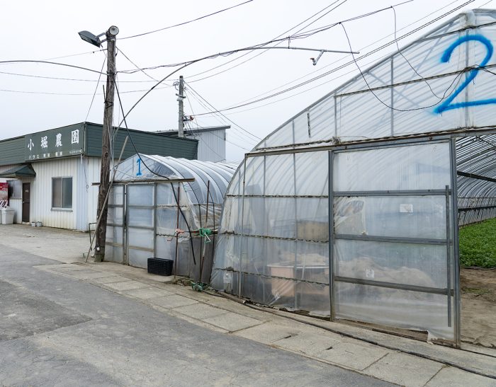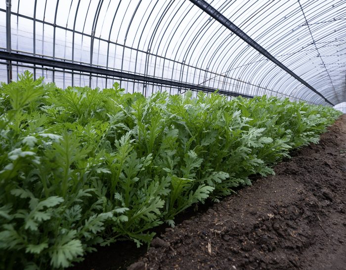 津軽平野に30棟ものハウスが並び、その中で春菊が栽培されている。