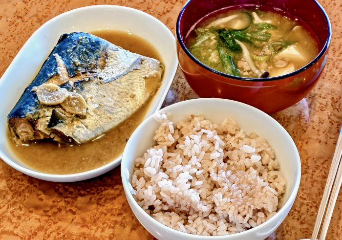 息子の昼ご飯は鯖の味噌煮と納豆汁