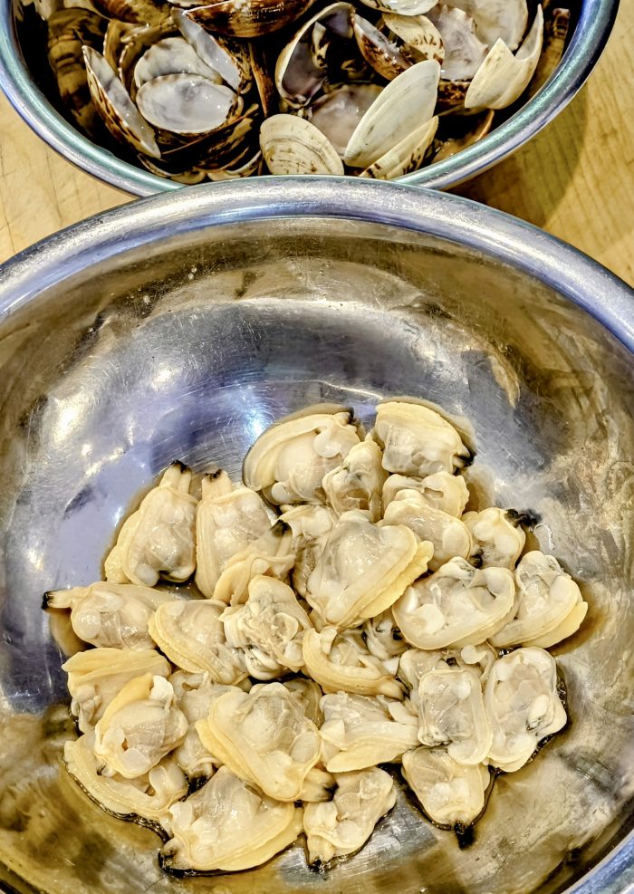 出汁で炊いて殻から外し、砂を確実に除去する