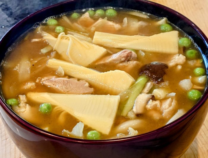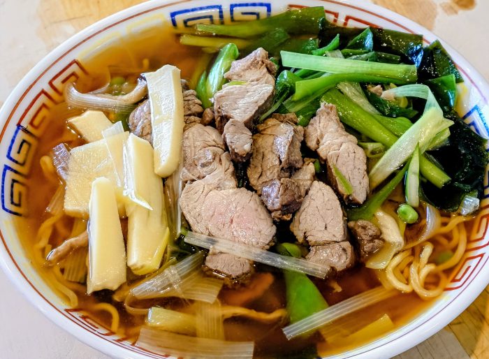 九条ねぎ、筍、わかめ、平茸、梅山豚のヒレ肉チャーシュー