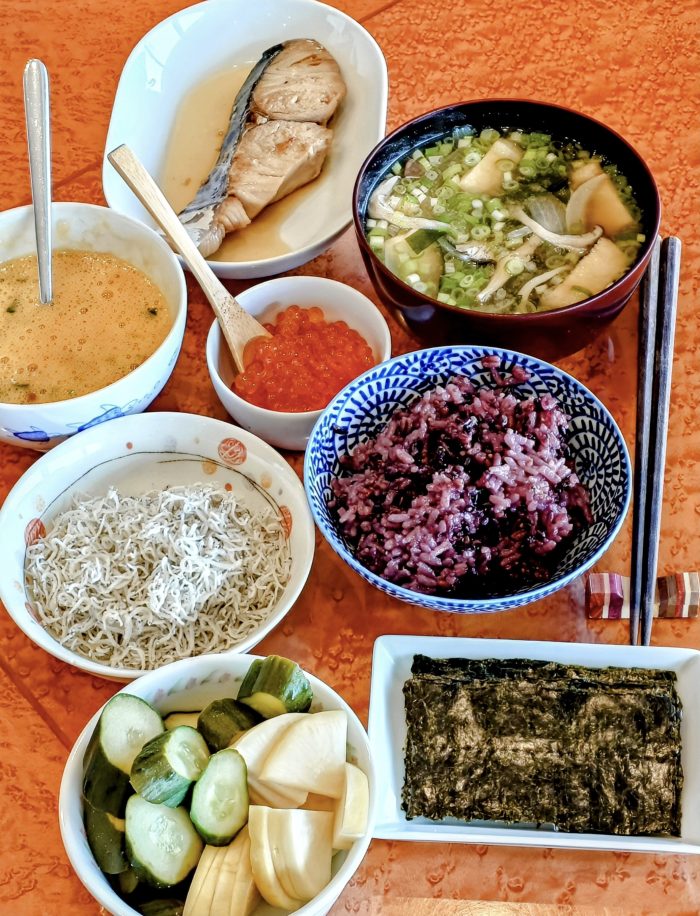 雑穀米と味噌汁(玉ねぎと豆腐とわかめと平茸)